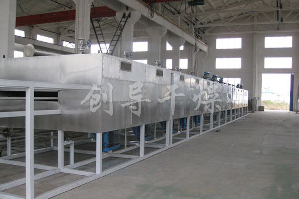 物料由加料器均匀地铺在网带上,网带一般采用12-60目不锈钢丝网,由传动装置拖动在干燥机内移动。干燥机由若干单元组成,每一单元热风独立循环,部分尾气由专门排湿风机排出,废气由调节阀控制,热气由下往上或由上往下穿过铺满物料的网带完成热量与质量传递的进程,带走物料水份。网带缓慢移动,运行速度可根据物料温度自由调节,干燥后的成品连续落入收料器中。上下循环单元根据用户需要可灵活配备,单元数量亦可根据需要选取。